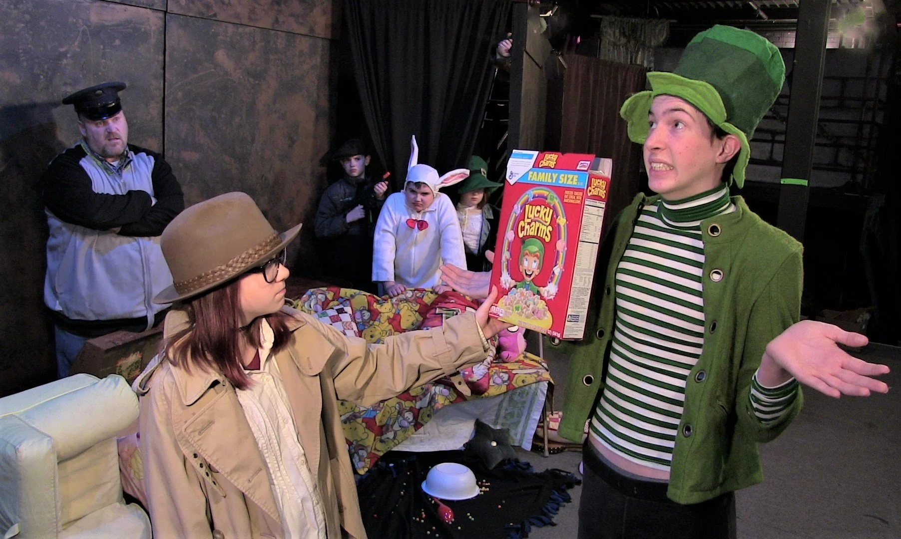 ROLES: Ecstatic Theatrics needs child and adult actors to play Leprechauns, Keebler Elves, animal rights rescuers, TV crew, police, detective, Senators, kidnappers, an industry villain, radio advice lady, old lady secretary, the Trix Rabbit & a high strung, tall, skinny Lucky. Roles are absurd, active and funny.